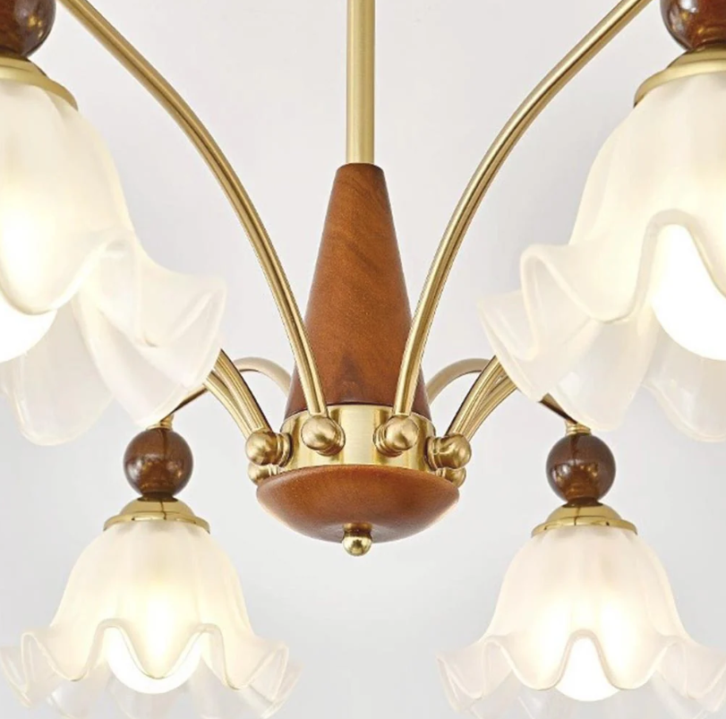Combinando metal, madera con vidrio, esta lámpara de araña muestra un aspecto único y elegante.